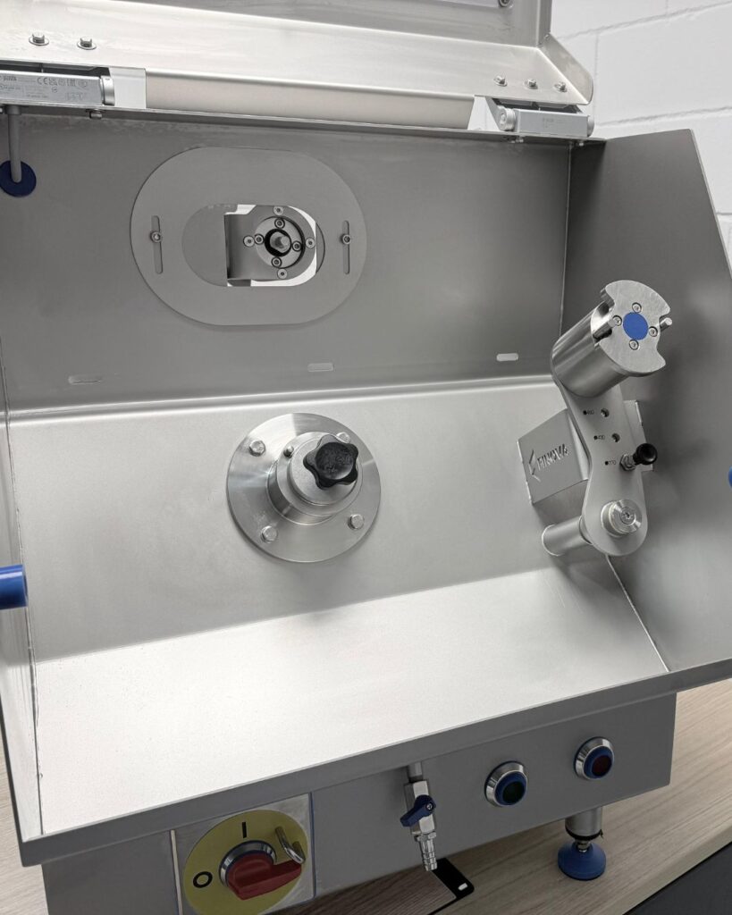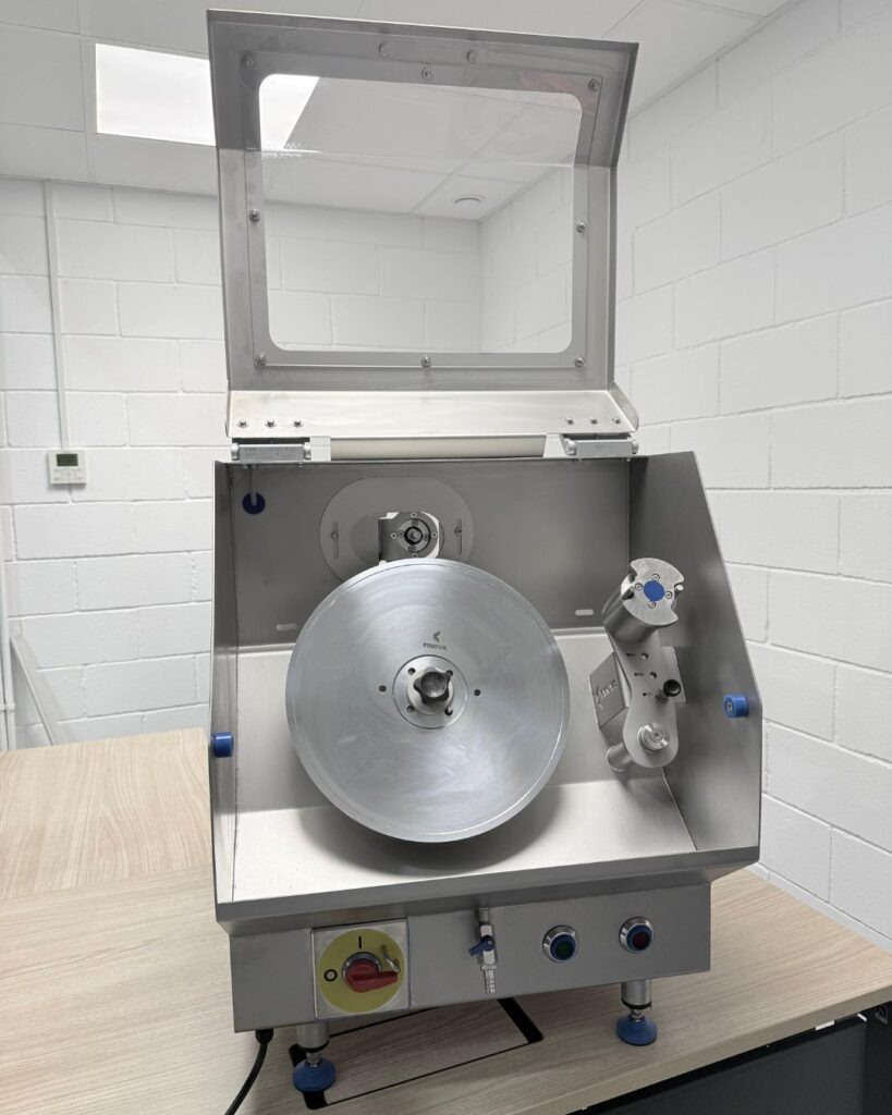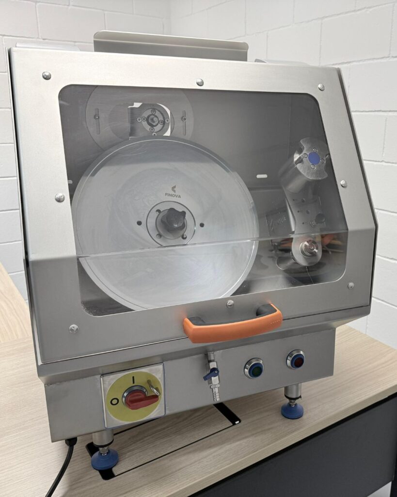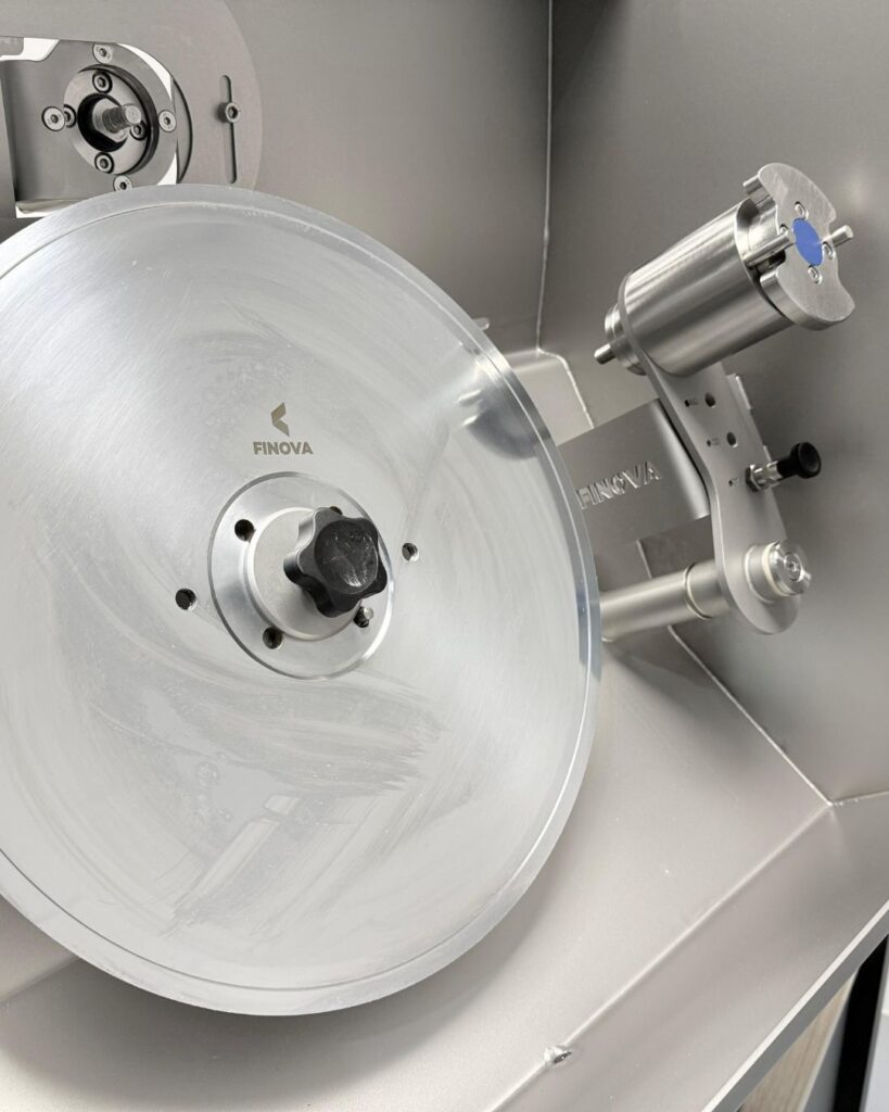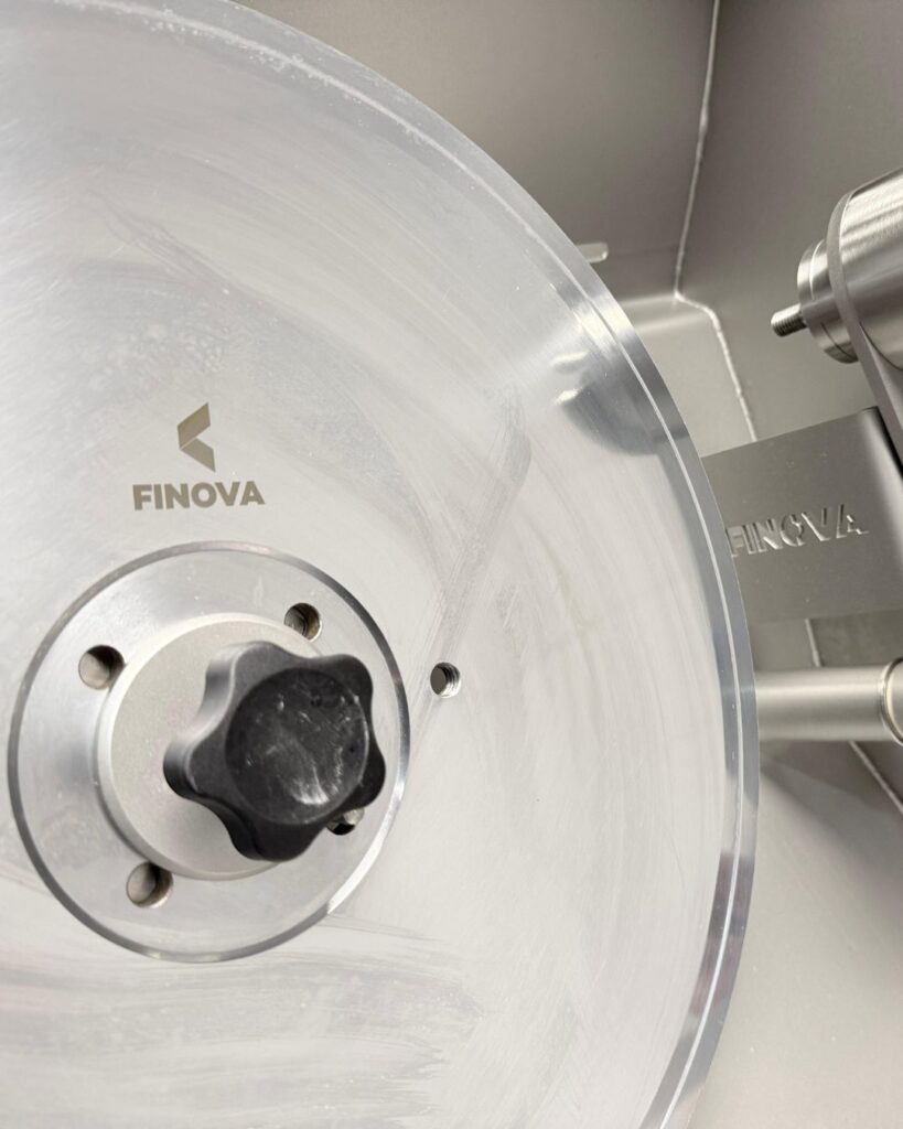 Uno de los puntos fuertes de la afiladora de cuchillas circulares es su capacidad de adaptación. La velocidad de rotación es variable y puede ajustarse en función del material específico de cada cuchilla. Además, el ángulo de afilado es modificable gracias a un indicador de inclinación integrado, que permite al operario configurar el equipo de forma precisa según las necesidades de cada herramienta. Esta versatilidad hace que el AGS-300 se adapte de forma óptima a las diferentes configuraciones de las cuchillas de las loncheadoras SliceFil de Finova.